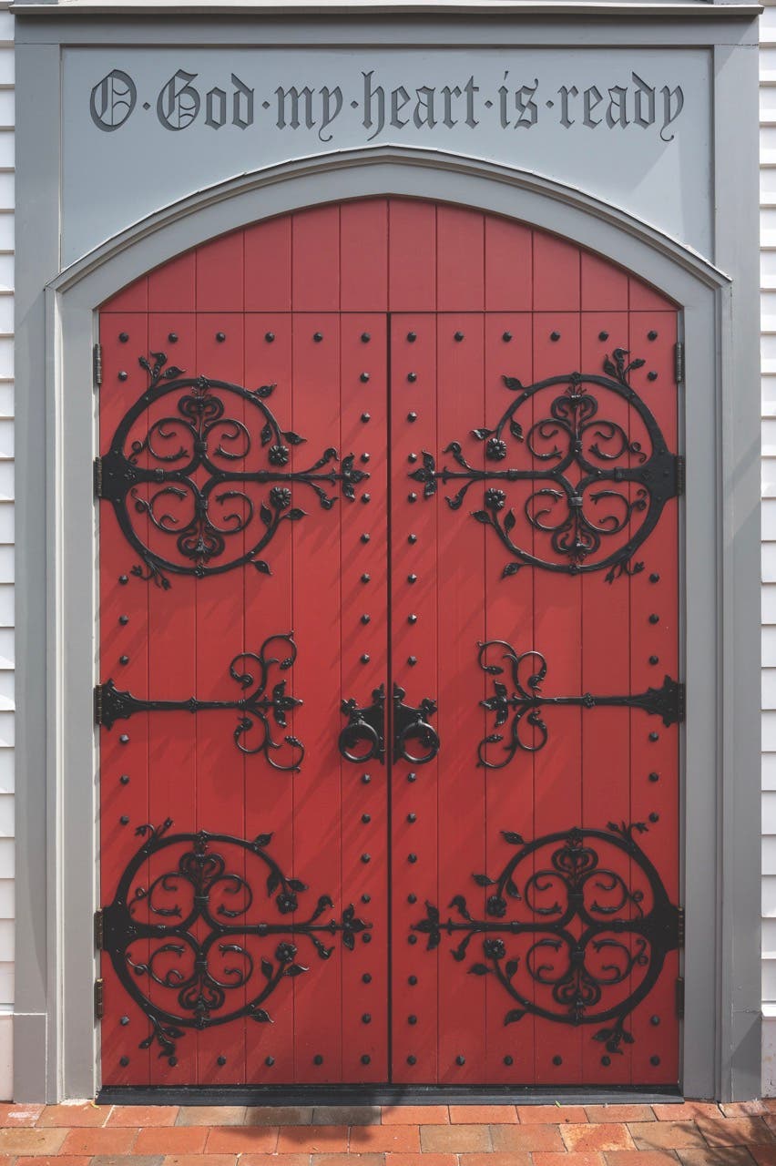 The new space is inspired by the medieval monastic tradition of the Galilee Porch, a place to welcome pilgrims. The large red doors, inspired by those of St. Mark’s Episcopal Church in Philadelphia, which fittingly feature sinuous black-iron straps festooned with Jack-in-the-pulpit blooms, are bolstered by the opening of Psalm 108, “O God, my heart is ready” over the entry.