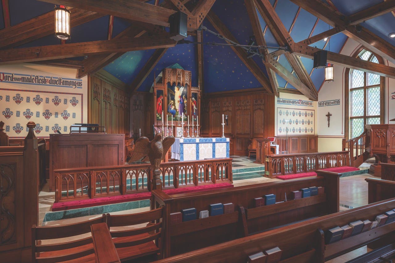 The original Carpenter Gothic chapel, postcard pretty, was a charming place for prayer. Through the years, as the congregation grew, so did its footprint: The chapel was joined over the decades by a connected parish house, a social hall, and, in 2002, by a new worship space with offices below.