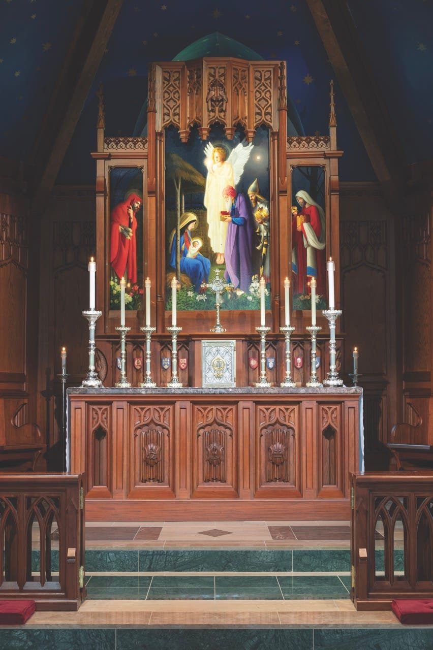 The new marble-topped freestanding altar is accompanied by a matching altarpiece directly behind it. Elaborately carved, it features a hand-painted triptych of the Adoration of the Magi titled “The Star of Bethlehem” painted by realist artist Eric Johnson of the Academy of Realist Art, Boston.
