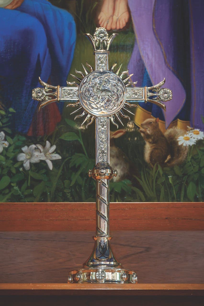 The new silver altar cross, also designed by Cram and Ferguson Architects, has a central medallion featuring the Paschal Lamb holding the flag of victory, symbolizing the resurrection, framed by a crown of thorns.