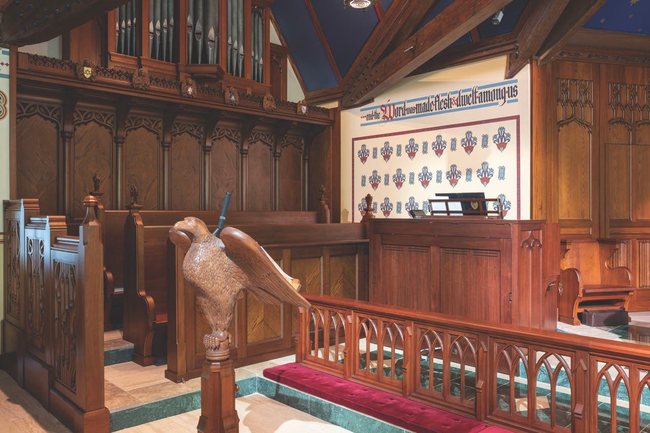 While the pews are not new, they were rearranged, and a new hand-carved eagle lectern was added, crafted by English woodworker Sarah Goss.
