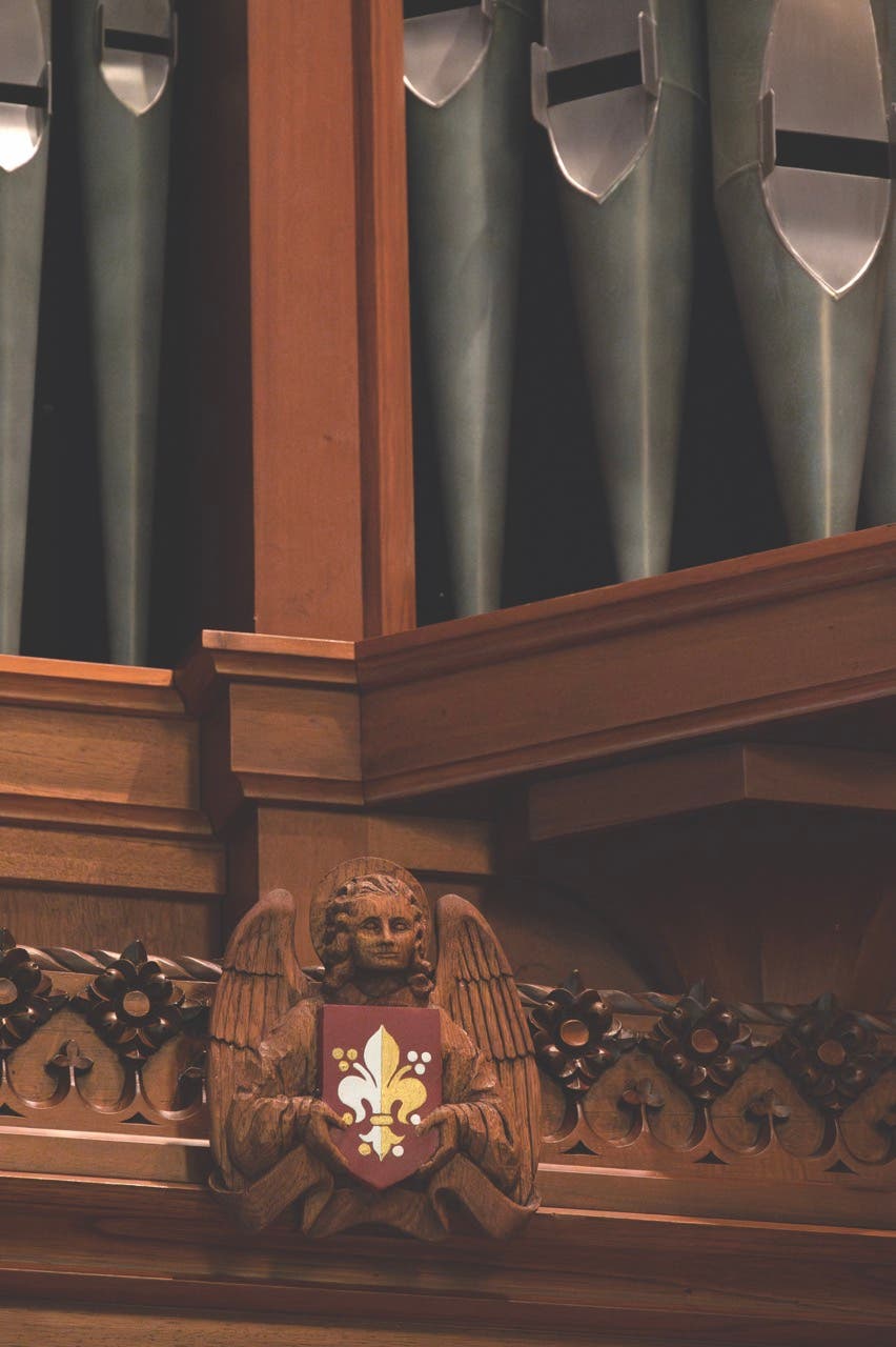 This paneled space is under the new pipe organ facade. Six angels, four with shields bearing symbols referring to the history of church music, and two with musical instruments, crown the flower-crested ledge supporting the organ front.