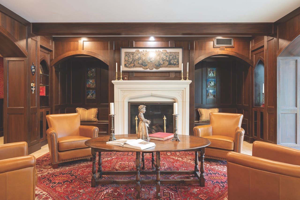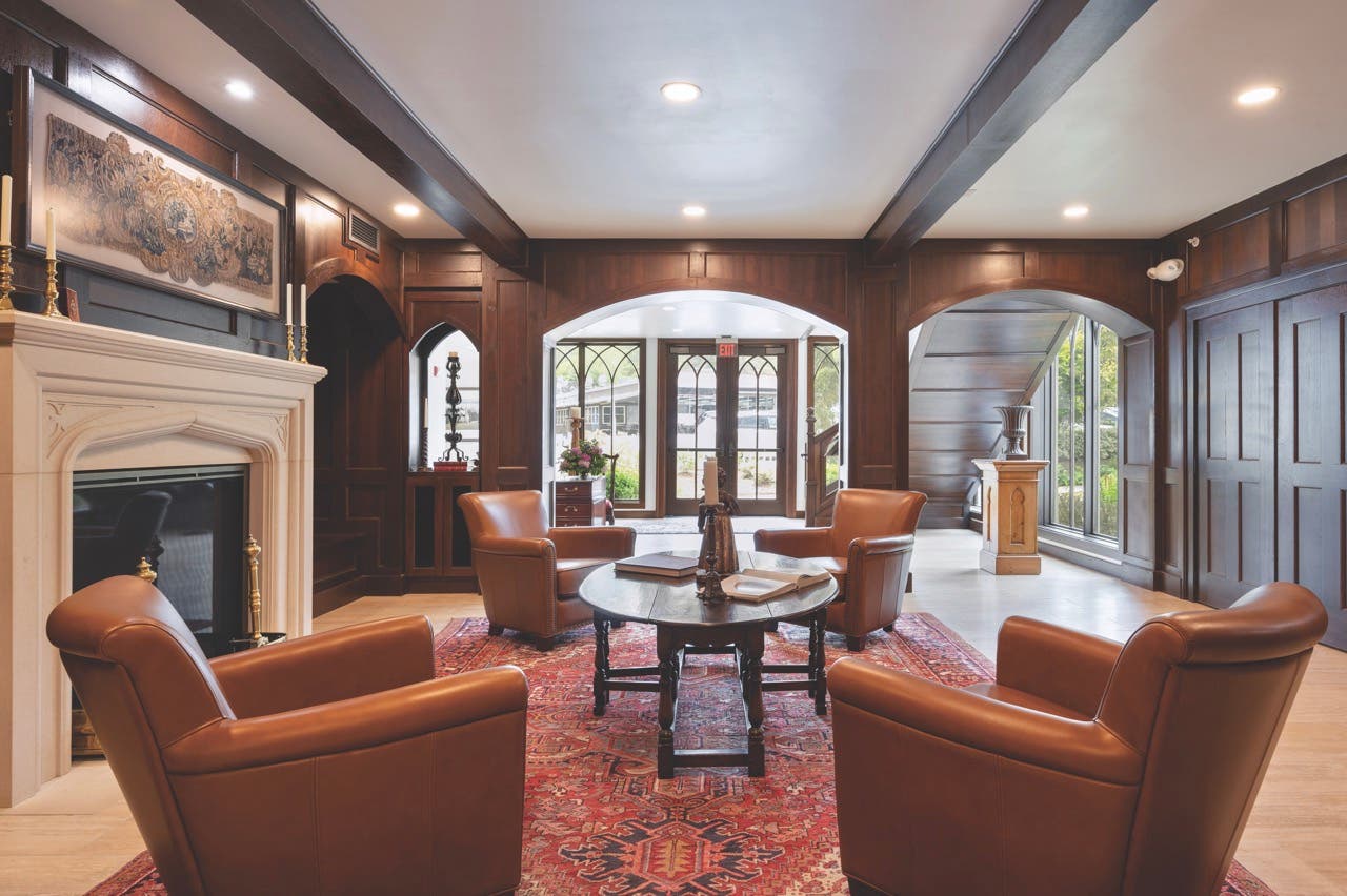 In the newly renovated parish house, a first-floor paneled sitting area with a fireplace and recessed seating alcoves welcomes parishioners.