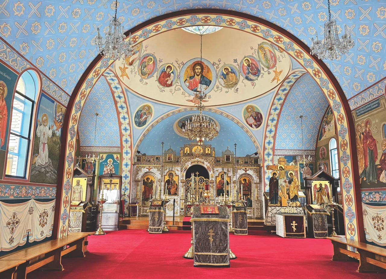 At the Entrance into the Temple of the Theotokos, his work graces the interior with images of Christ, the Russian saints, and one of the first martyrs of the Russian Revolution. “Like many Orthodox churches, it’s wall-to-wall murals,” says Victoria Jean Bingham, founder of Fayetteville-based Buon Fresco, the firm responsible for the restoration. “But these are not just any murals– they are the work of what was arguably the most important iconographer in the world at that time.”