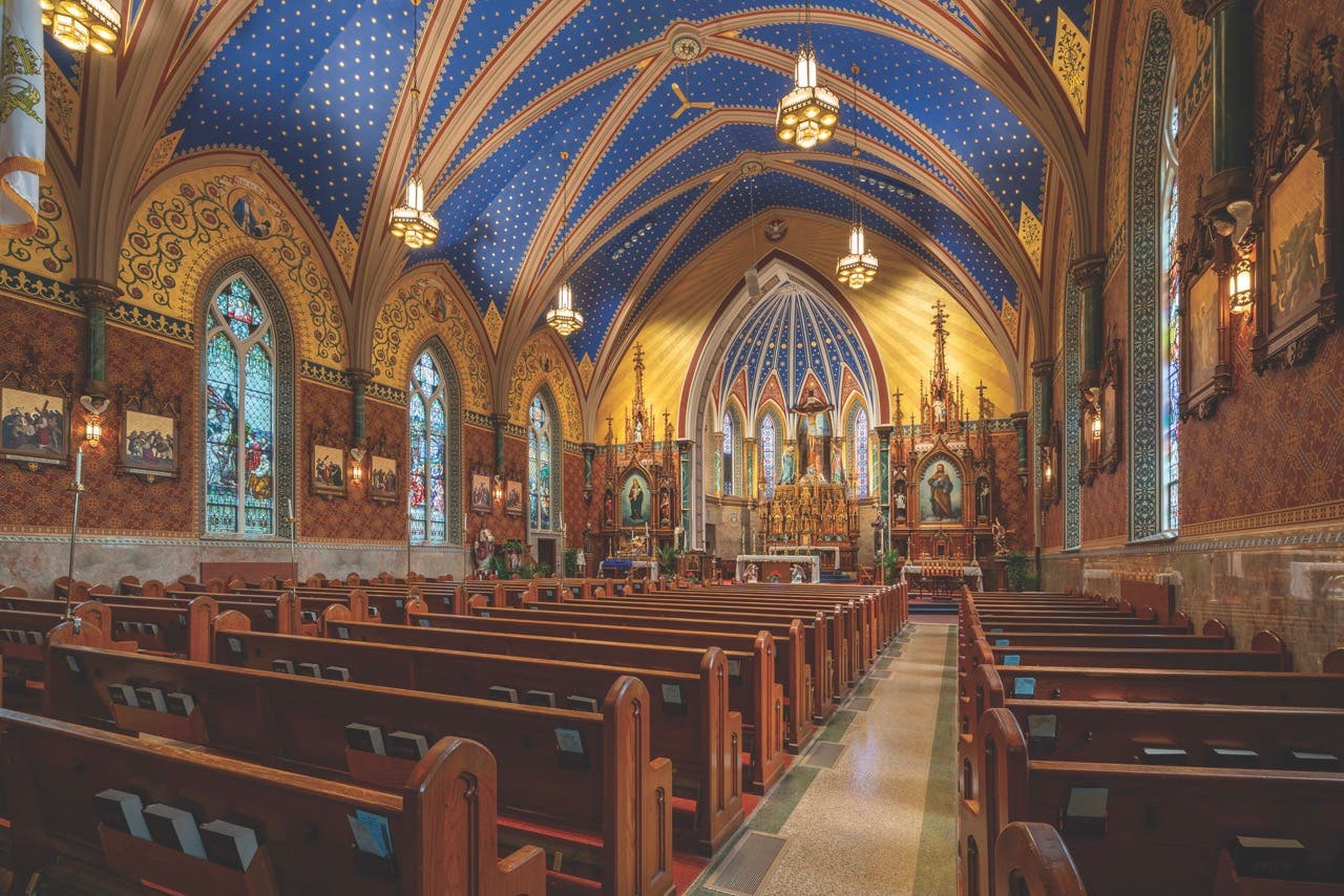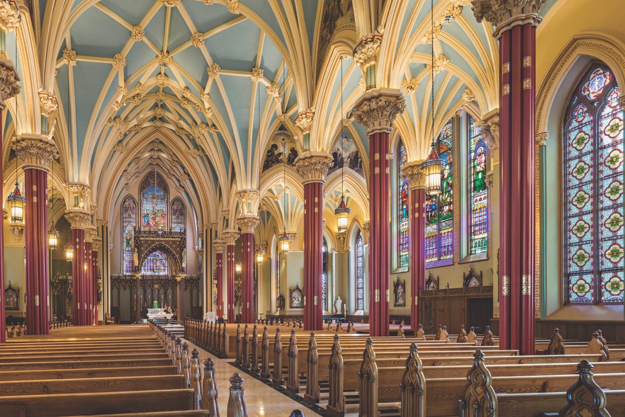Traditional ecclesiastical architecture calls out for decorative painting and stained glass, elements that are aesthetically and spiritually uplifting when paired with religious iconography.