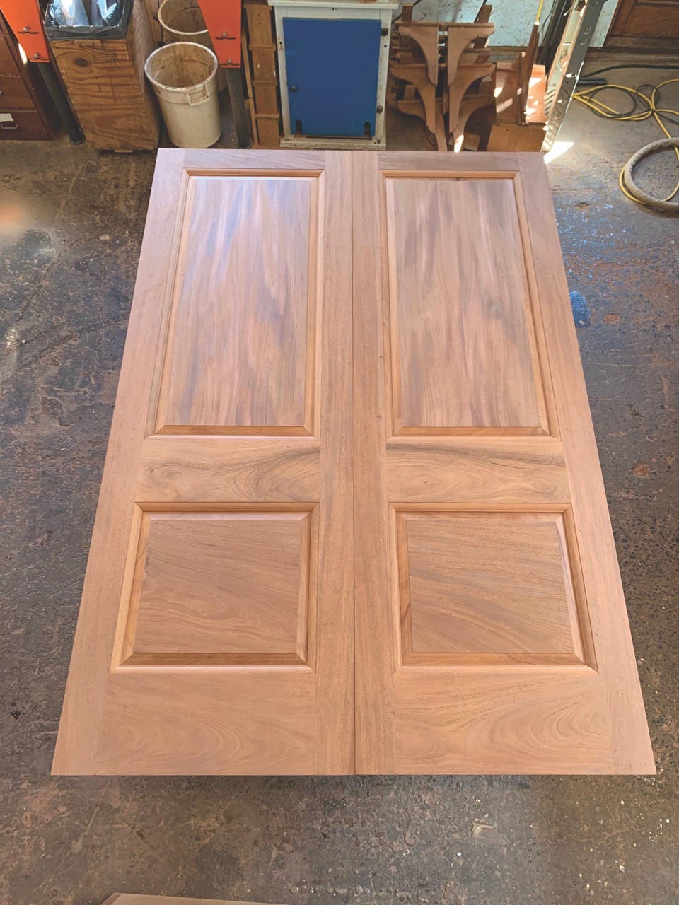 That cogitation made for a smooth, straightforward fabrication process. In the Historic Doors workshop, the team used traditional mortise and tenon joinery—the doors feature no screws, dowels, or other fasteners—while incorporating a few intentional doses of modernity, like boatbuilding epoxies and machines outfitted with custom knives to carve the profiles. “These were as close to original construction techniques without busting out hand chisels,” Hendricks says with a chuckle. The only true (and client-approved) deviation from the precedent regarded the engineered raised panel made from high-end plywood placed inside a mahogany frame with applied mahogany skin, a variation of the eighth-inch mahogany skin on the original panels. “They edge-glued the mahogany for the main structure of the panel and then applied the skin,” Hendricks says, “whereas we made a mitered frame so you don’t see end grain.”