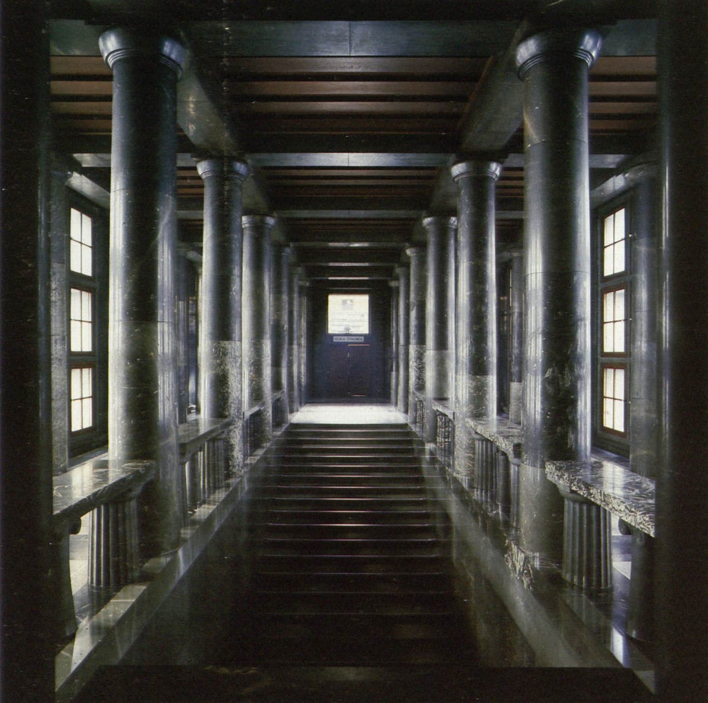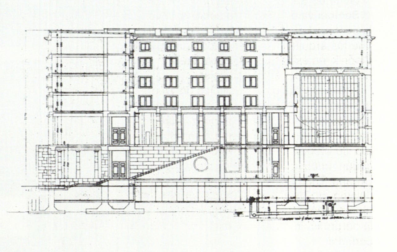 The block’s inner court lights the building’s wings above the lower two floors where a grand stair leads up to the reading room and side aisles to other rooms. The aisles on this grand entrance’s upper level is a hypostyle with 32 unfluted polished baseless Tuscan columns of local Podpeč limestone carrying simple grillage for the ceiling. Lining the aisle’s sides are tables, each one supported by a pair of very stout fluted Tuscan columns with a baseless, tapered Ionic column (not shown in the section) between them. Their prominent presence testifies to the belief that the Etruscans, the earliest builders in Ljubljana, were Serbians who migrated and founded Rome. Throughout the building are Plečnik’s bravura inventive details and his beloved fluid forms like those that the Art Nouveau used.